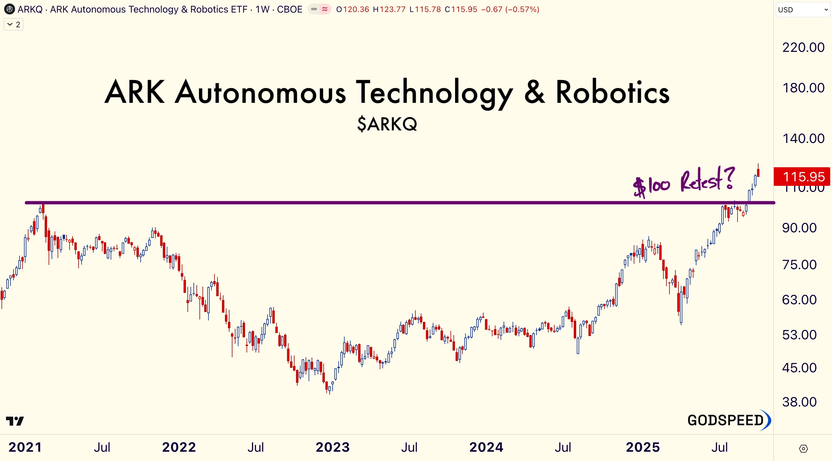ARK’s Autonomous Technology & Robotics ETF $ARKQ was one of the strongest thematic ETFs going into Friday. $ARKQ fell -4.73%. If the selling pressure continues, the ETF may tick support at $100.