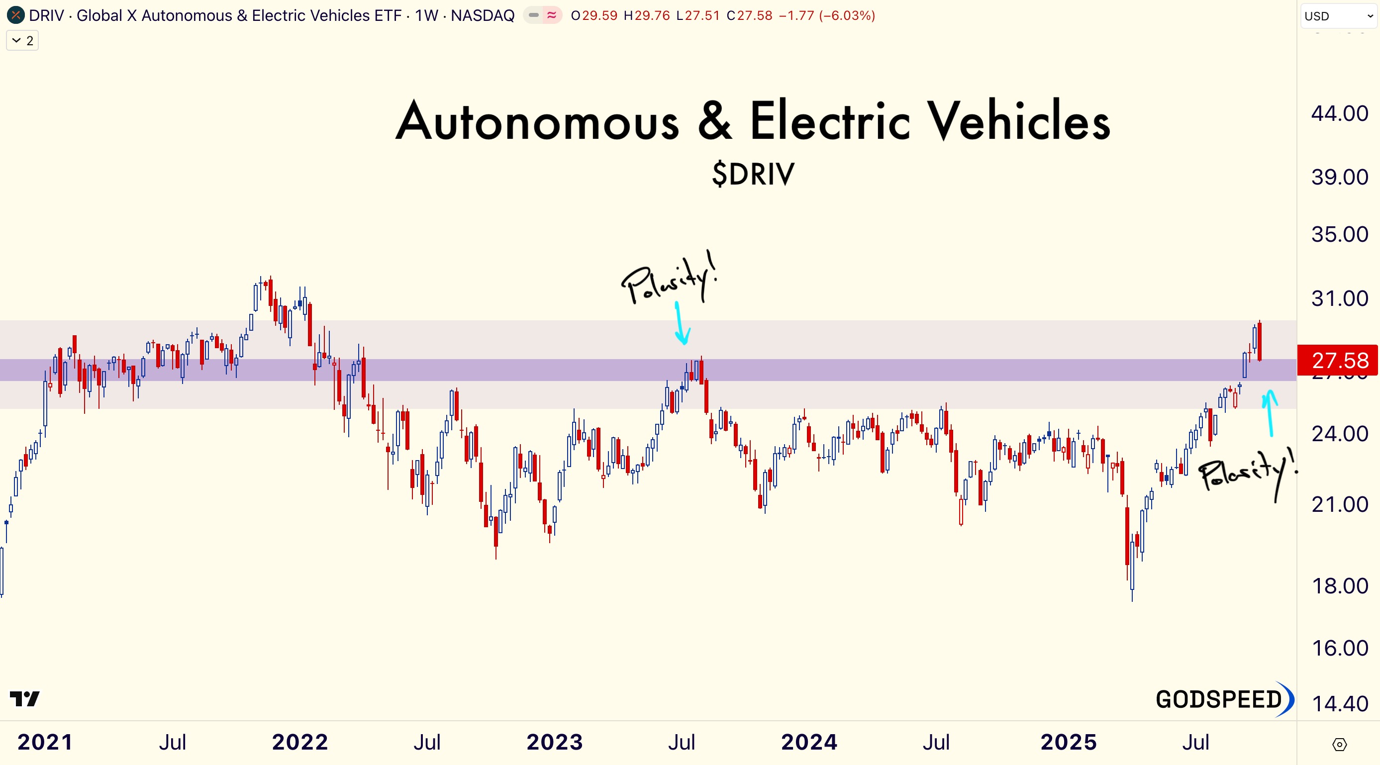 I’ve used the Global X Autonomous & Electric Vehicles ETF as a proxy for this trend. $DRIV dropped -5% Friday. I’d love to see it hold above 26.50 and create a buyable base.
