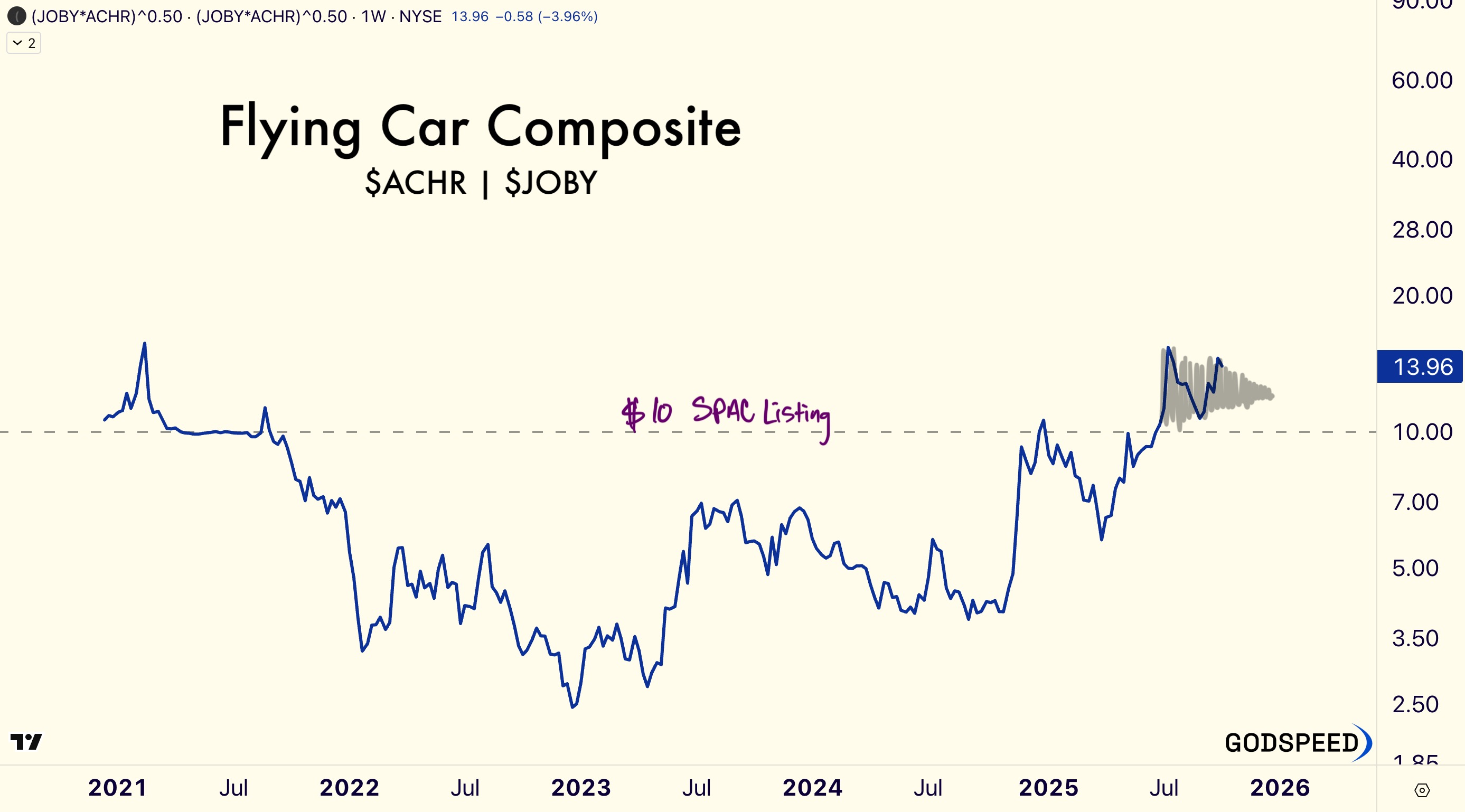 eVTOLs are nearing FAA Type Certification and it appears to be another two horse race. If we look at an equally-weighted composite featuring Joby Aviation and Archer Aviation we can see a flag forming above the SPAC listing price.