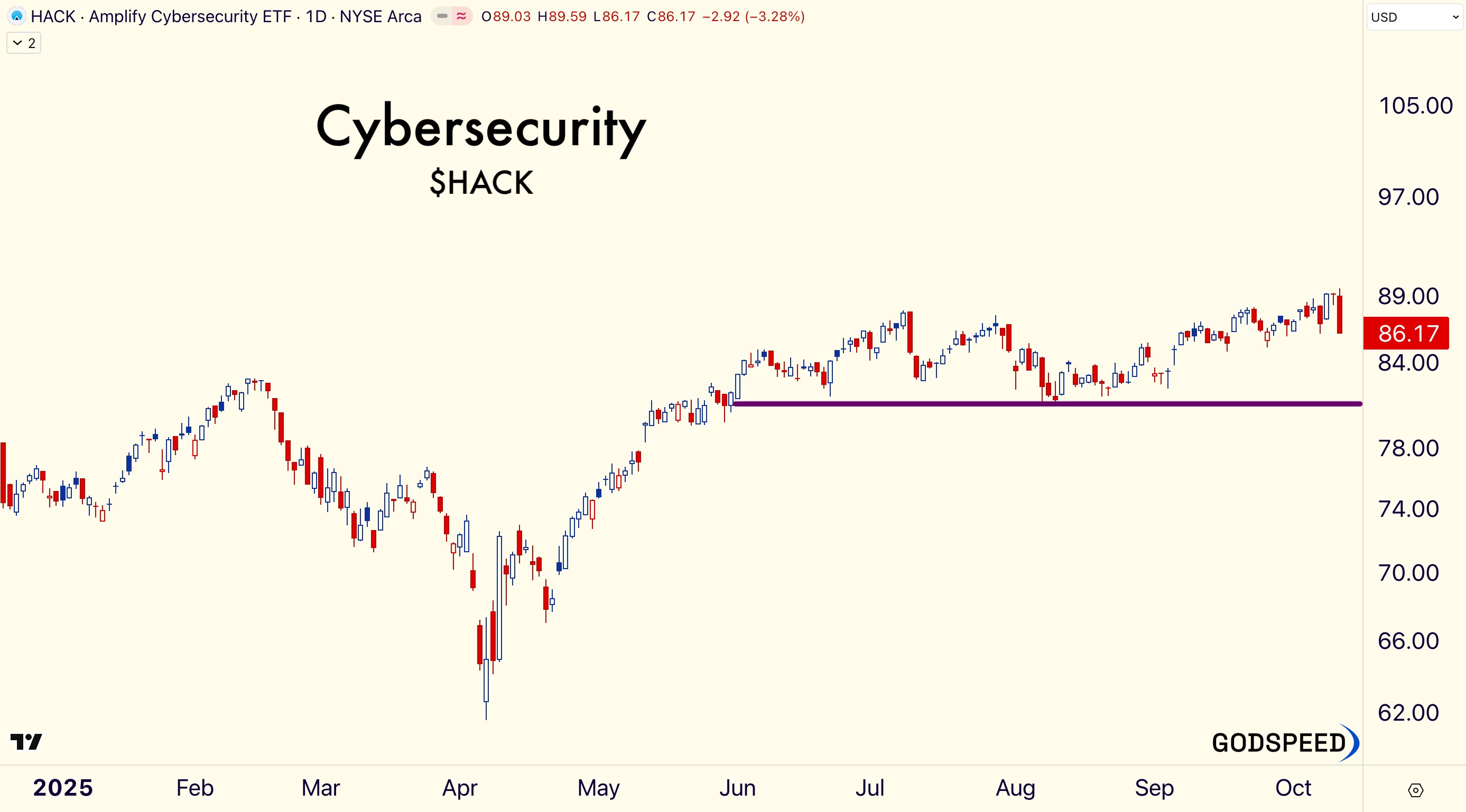 Cybersecurity is a top priority. Amplifies’ First Cybersecurity ETF $HACK cracked -3.28% Friday, but has maintained its primary uptrend. If we break below 81, all bets are off.