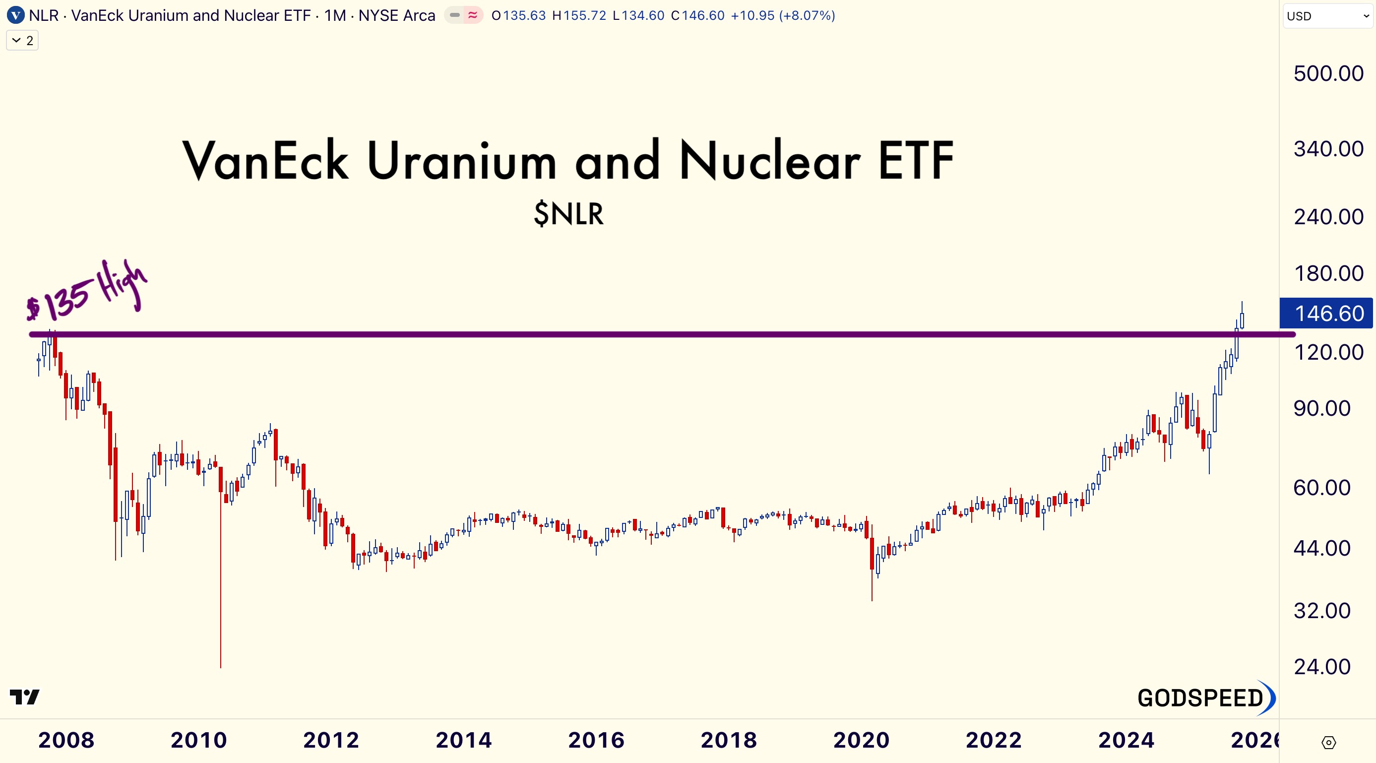 Nuclear and Uranium continue to cook. As long as VanEck’s Uranium and Nuclear ETF $NLR holds 135 (2007 high) the Nuclear Renaissance remains true.