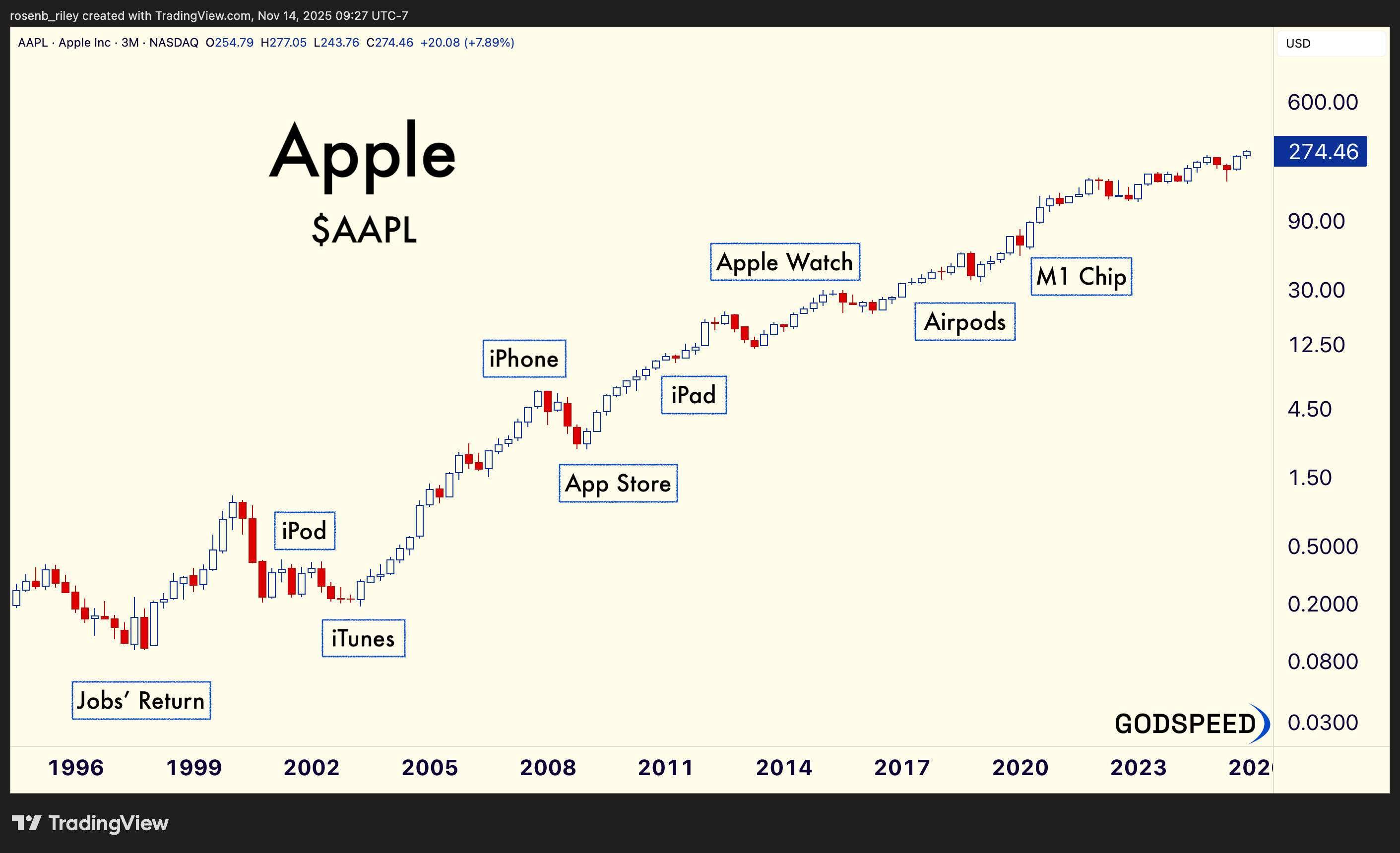 In this post, we examine Apple’s transformation from Steve Jobs' return to the present day. We’ll highlight the product breakthroughs, ecosystem expansion, and strategic discipline that led to an outstanding 1,600x return in less than 3 decades. Using frameworks from William O’Neil (CANSLIM) and Nicolas Darvas, we’ll explore why Apple was not just a great company, but a once-in-a-lifetime investment opportunity.