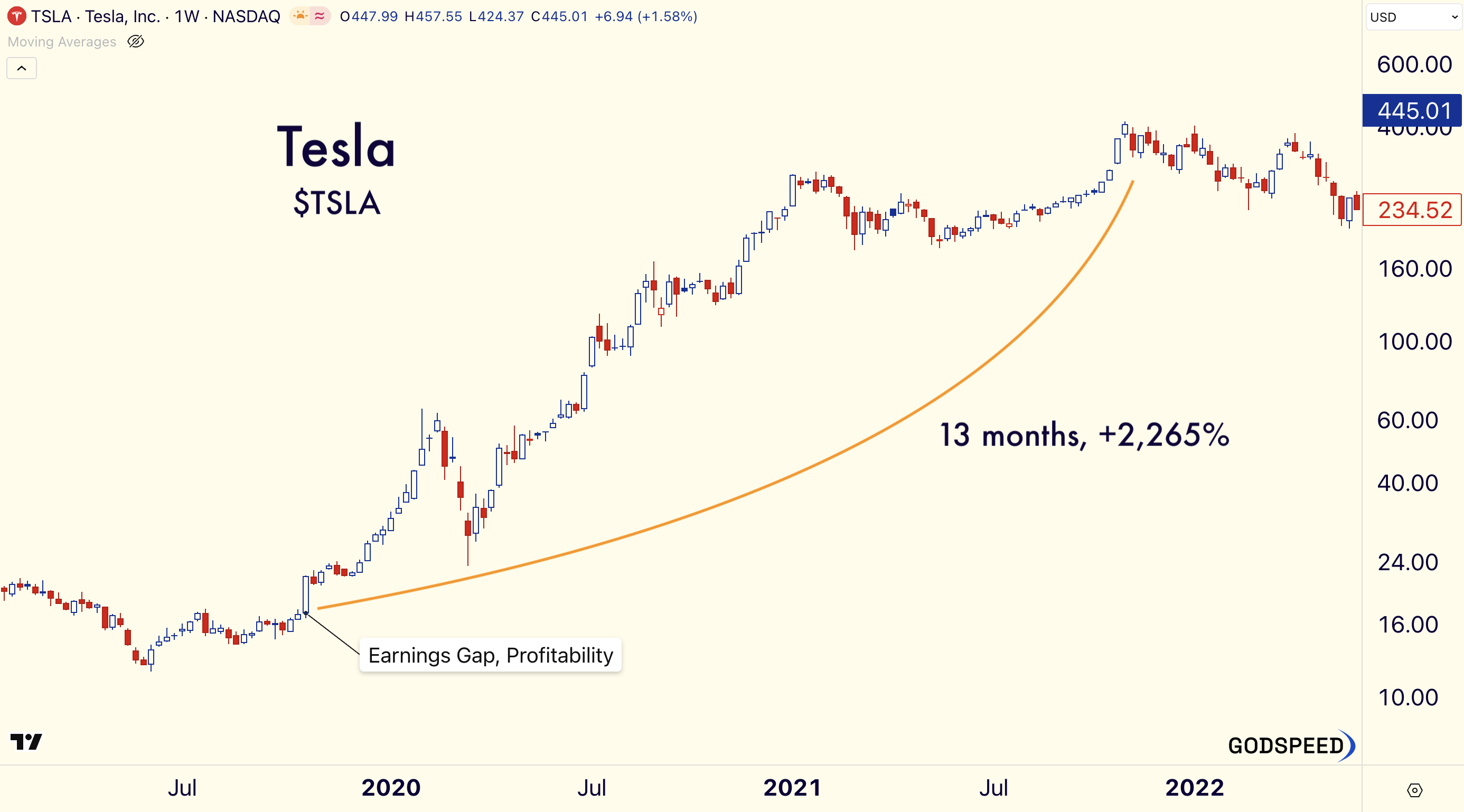 Or even $TSLA - its first profitable quarter, posted in October 2019, led to a historic run from 20 to 400.