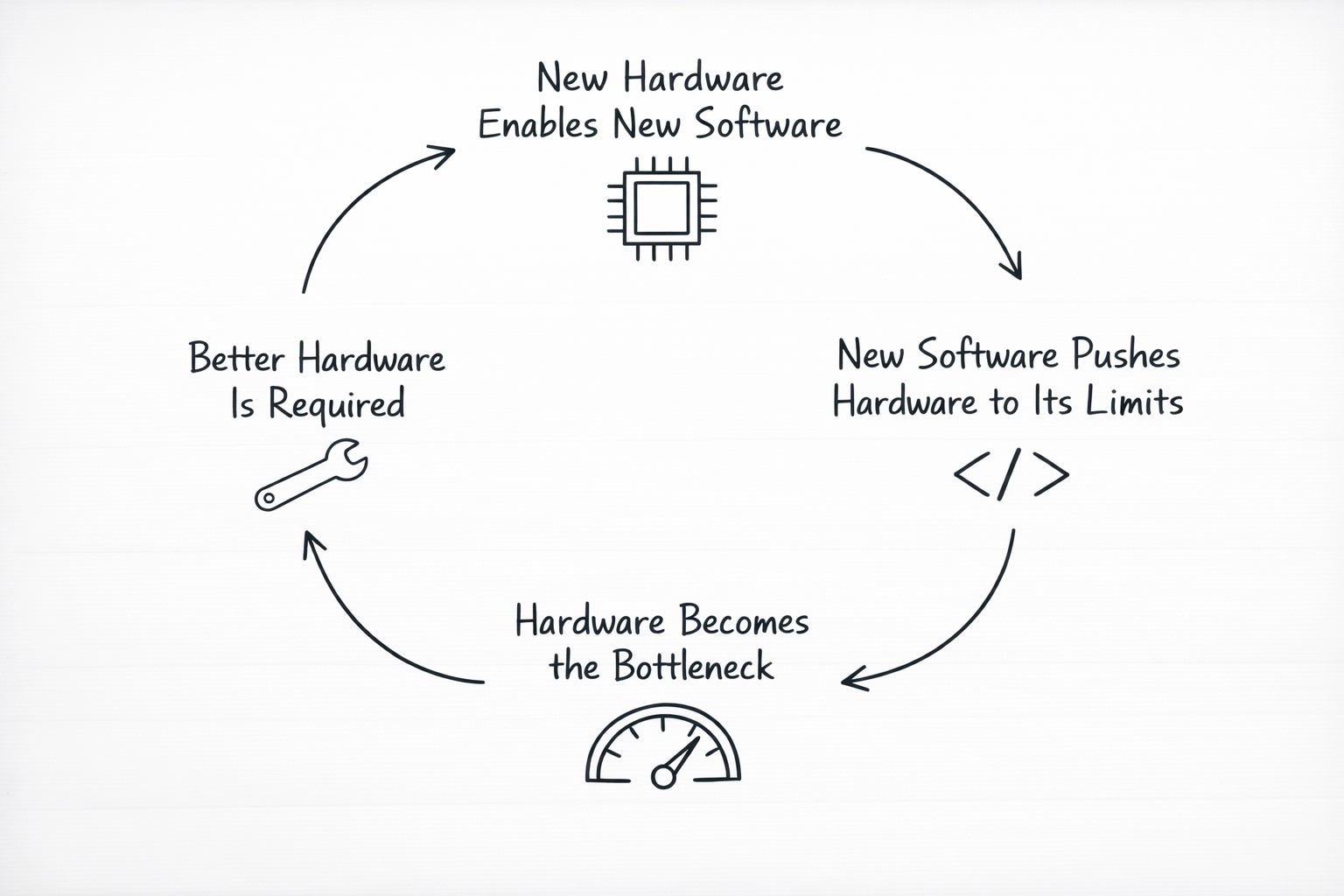 Software may feel invisible, but it runs on real things: chips, memory, electricity, and data centers. When software becomes more powerful, existing hardware eventually can’t keep up.