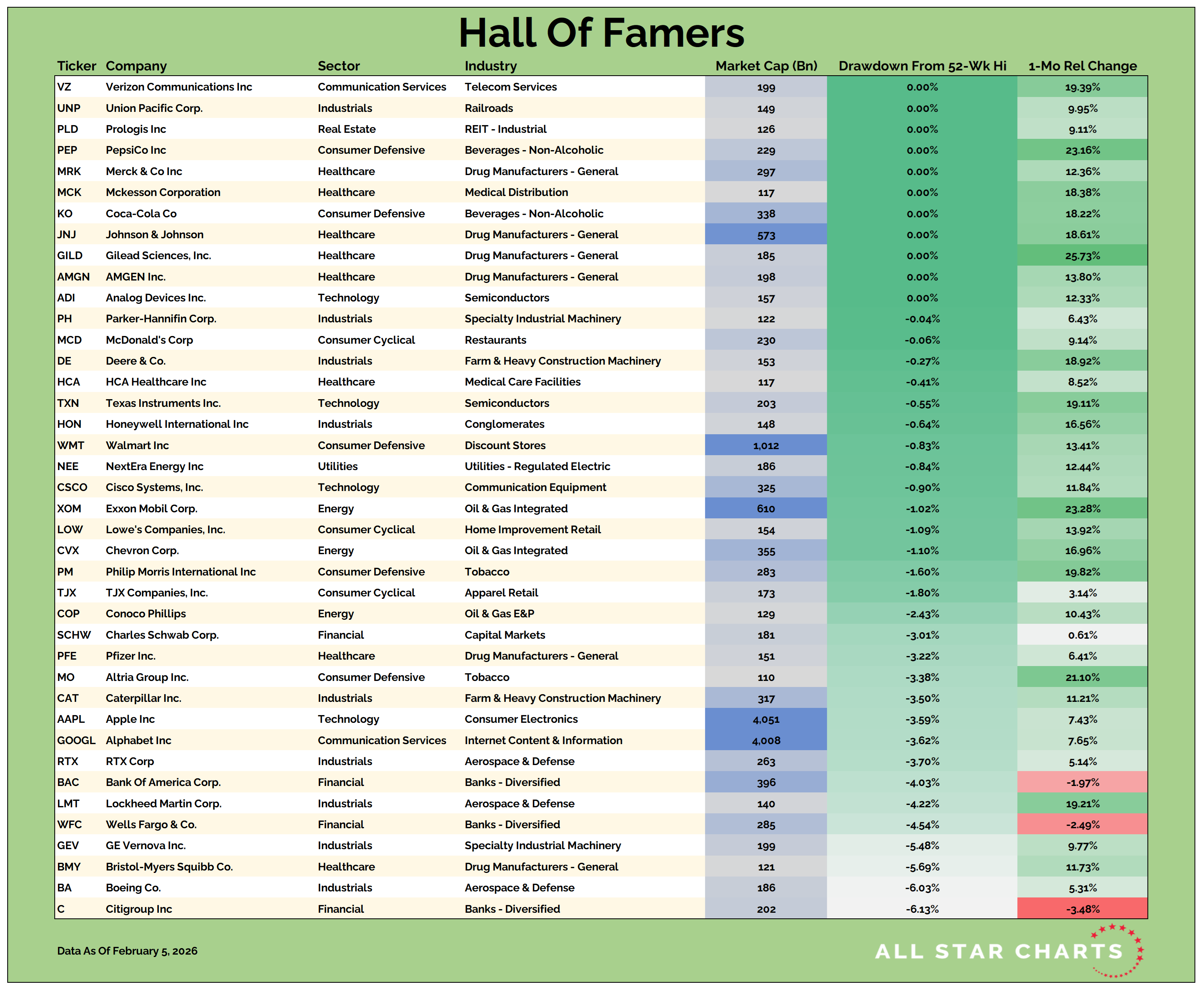 Stocks like Verizon, Union Pacific, Pepsi, Coca-Cola, McDonald’s, and Wal-Mart are at or just shy of 52W highs. You can see more of what’s working in the latest Hall of Famers report.