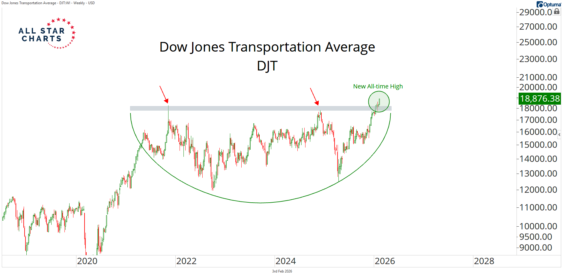 The Dow Transports just broke out of a 4-year base as energy, materials, industrials, and consumer staples closed at new weekly all-time highs.