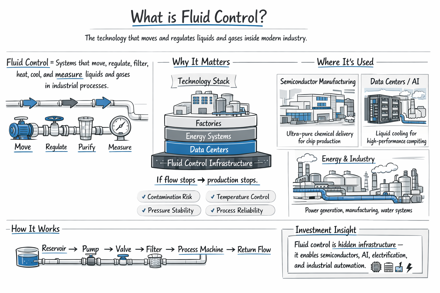 Fluid control is the technology that precisely moves, regulates, and manages liquids and gases in industrial processes - enabling everything from semiconductor manufacturing and energy systems to data center cooling and factory automation.