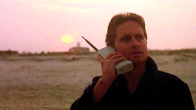 Gordon Gekko stands barefoot on the beach, wielding a cell phone the size of a cinder block.