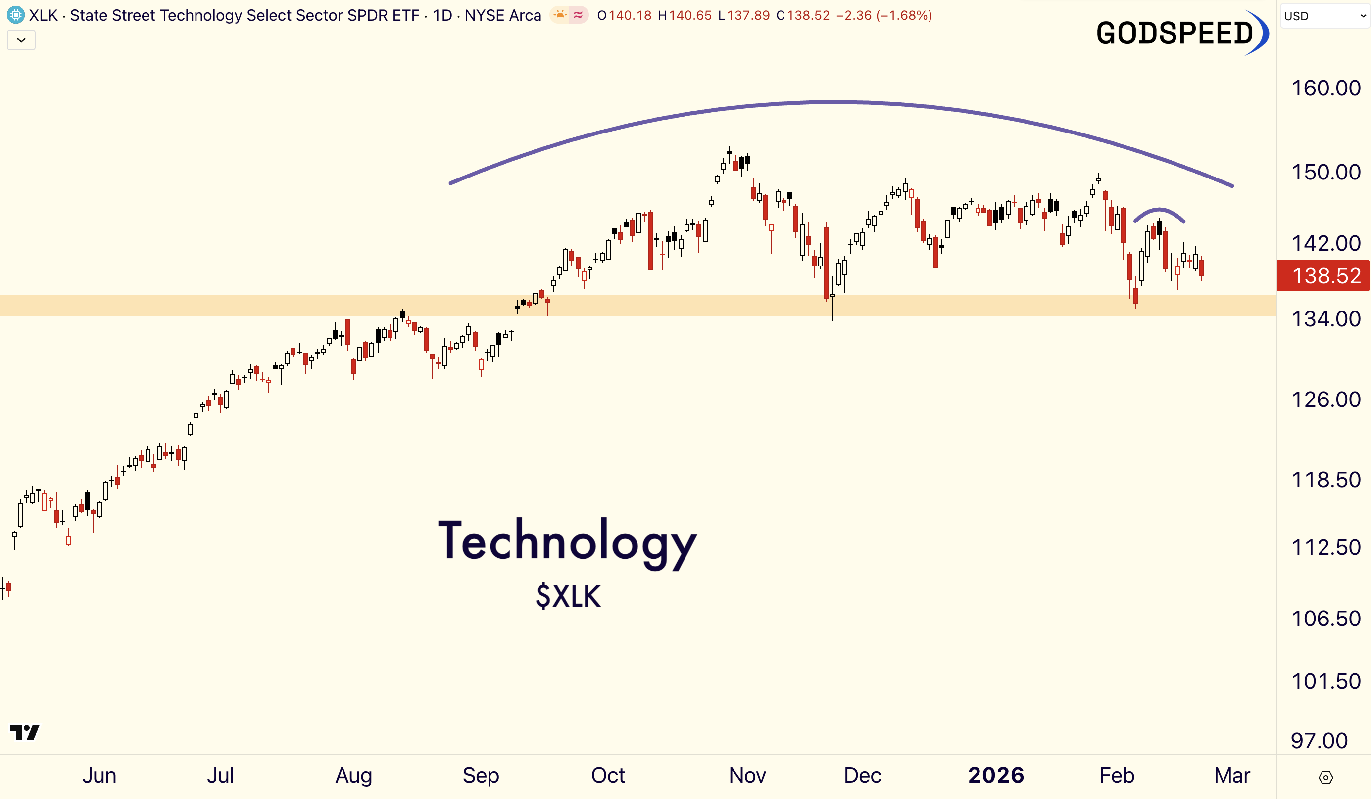 Technology stocks are in rough shape. $XLK is down nearly 10% from its October 2025 all-time high, and feels like it wants to leak lower.